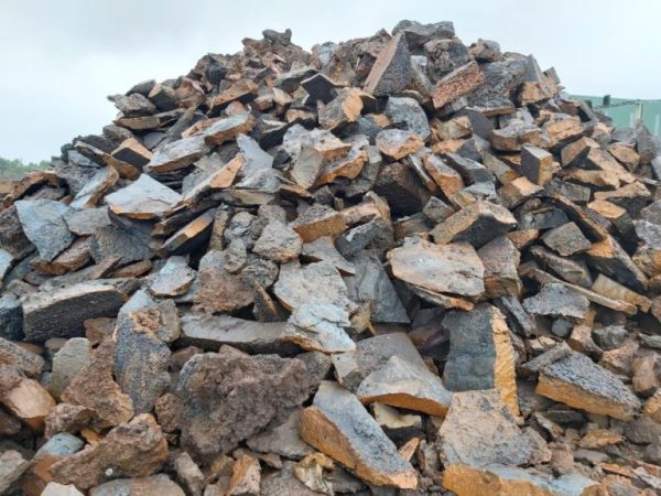 Beach iron is produced when high purity pig iron slabs are crushed into manageable shaped blocks. Due to its high carbon, low residuals and minimal slag content beach iron provides significant value to steelworks and grey iron foundries. Beach iron pieces vary in size but generally have a maximum thickness of 400 mm, a maximum width of 750 mm and a maximum length of 1200 mm or 750 mm (depending on the amount of processing requested).